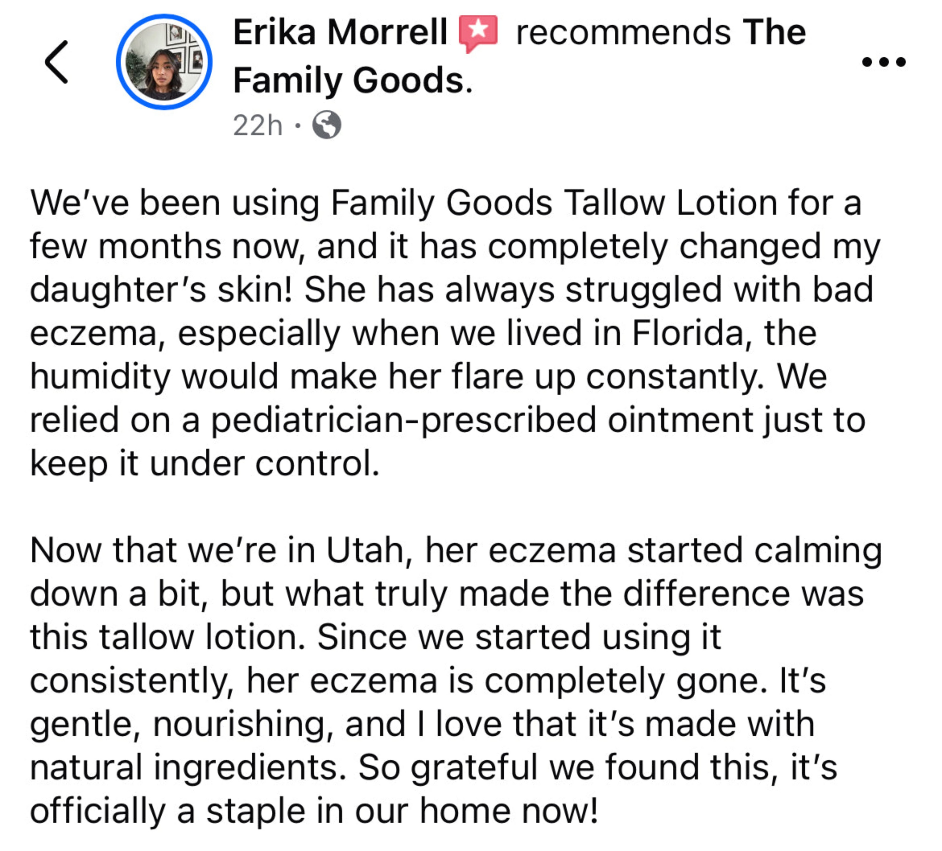 We've been using Family Goods tallow lotion for a few months now, and it has completely changed my daughter's skin! She has always struggled with bad eczema, especially when we lived in Florida, the humidity would make her flare up constantly. We relied on a pediatrician-prescribed ointment just to keep it under control.